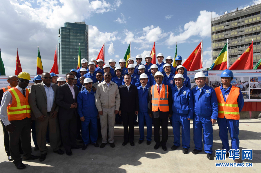 5月5日,中國國務(wù)院總理李克強考察亞的斯亞貝巴輕軌項目,埃塞俄比亞總理海爾馬里亞姆陪同。這是李克強同海爾馬里亞姆與施工人員合影留念。新華社記者李學(xué)仁攝
