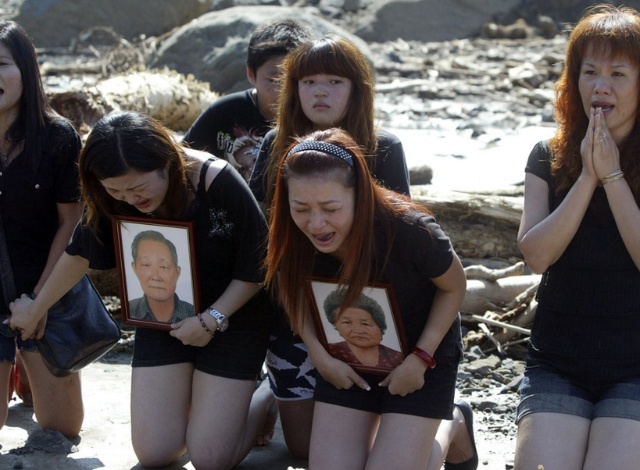 臺媒圖片:8月15日,小林村罹難者家屬帶著親人遺照穿山過河,回到小林村現場招魂。劉家一家40多個親人遭活埋,到了住家位置,親人跪地哭泣。