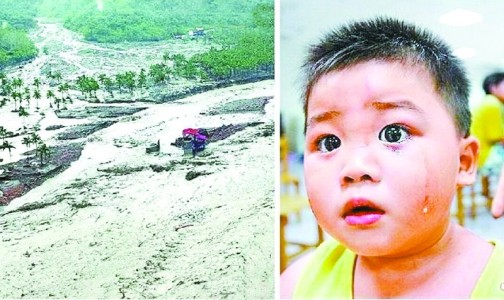 合成圖:左為慘遭埋村的小林村,右為小林村男童獲救后,因想念未脫困的父母,不斷落淚。圖片來源:臺灣《蘋果日報》