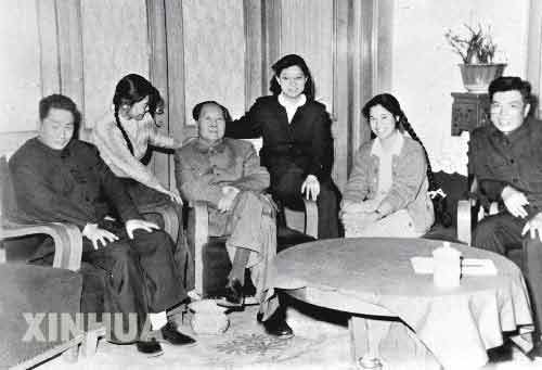 這是1962年春,毛澤東和毛岸青(左一)、邵華(右二)等在一起。(新華社發(fā))
