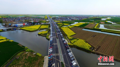 資料圖:2016年4月4日清明節,也是清明小長假的最后一天,江蘇興化千垛菜花風景區游人如織,公路變也成了一個“超級停車場”。孟德龍 攝