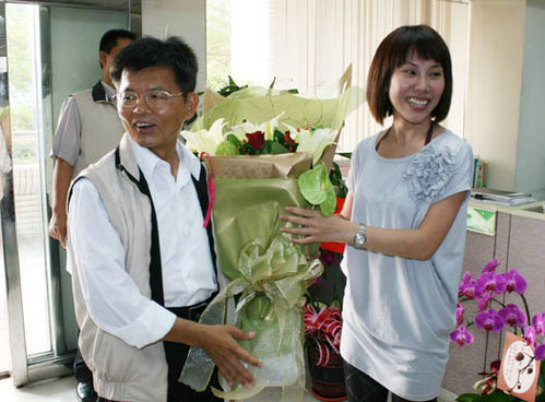 臺灣高雄縣長楊秋興(左)日前因大腸癌住院進行手術治療,14日辦理出院,返回縣府,受到員工獻花歡迎。