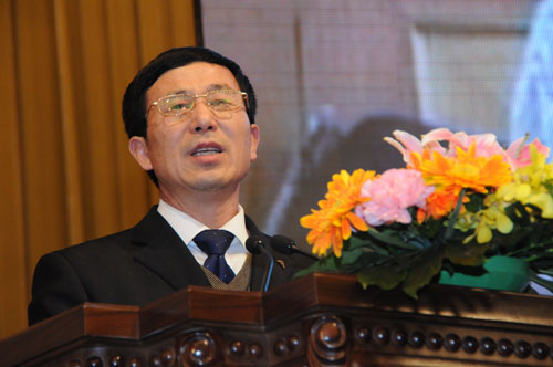 1月13日下午3時,沈浩同志先進事跡報告會在人民大會堂舉行,圖為沈浩哥哥、安徽蕭縣楊樓鎮人大主席沈明儒作報告。新華網 李清 攝