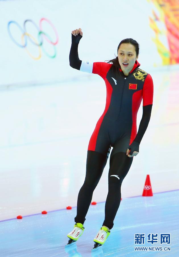 2月13日,中國選手張虹慶祝勝利。當日,在2014年索契冬奧會速度滑冰女子1000米比賽中,中國選手張虹以1分14秒02的成績奪得冠軍。新華社記者龔兵攝