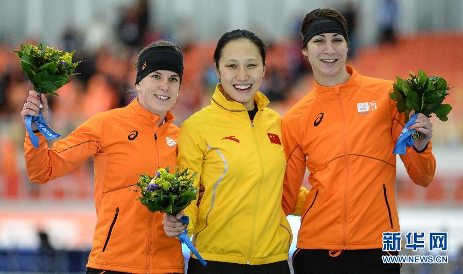 2月13日,中國選手張虹(中)、荷蘭選手維斯特(左)和她的隊友布爾在獻花儀式上。當日,在2014年索契冬奧會速度滑冰女子1000米比賽中,中國選手張虹以1分14秒02的成績奪得冠軍。荷蘭選手維斯特和布爾分獲亞、季軍。新華社記者王昊飛攝