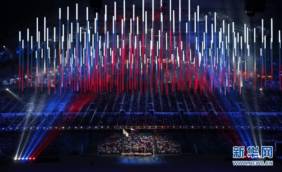 2月23日,俄羅斯國旗和奧運會會旗在閉幕式上飄揚。當日,第22屆冬奧會閉幕式在菲施特奧林匹克體育場舉行。   新華社記者王麗莉攝