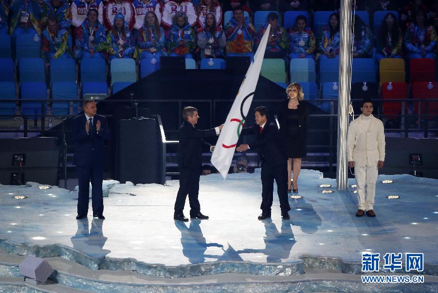 2月23日,2018年冬奧會舉辦城市平昌市市長李石萊(左三)從國際奧委會主席巴赫(左二)手中接過國際奧委會會旗。當日,第22屆冬奧會閉幕式在菲施特奧林匹克體育場舉行。 新華社記者王麗莉攝