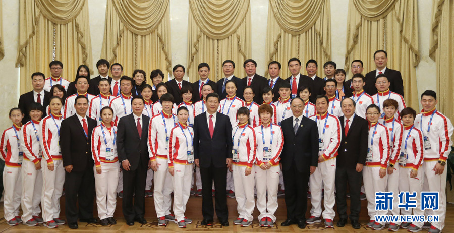 2月7日,中共中央總書記、國家主席、中央軍委主席習(xí)近平在俄羅斯索契親切看望參加第二十二屆冬季奧林匹克運動會的中國體育代表團。這是習(xí)近平同代表團成員集體合影。新華社記者 蘭紅光 攝