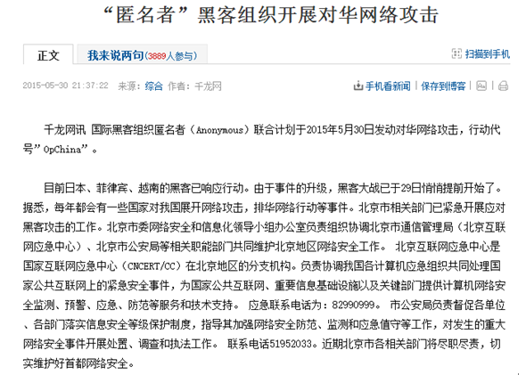 近日,由中央網絡安全和信息化領導小組辦公室、中央機構編制委員會辦公室、教育部、科技部、工業和信息化部、公安部、中國人民銀行、國家新聞出版廣電總局、 中國共產主義青年團中央委員會、中國科學技術協會主辦的“第二屆國家網絡安全周”開幕之際,敏感時期之際,各大媒體傳出,境外黑客組織宣傳將于 2015年5月30日發起針對我國的網絡攻擊。同時,360“天眼實驗室”向各媒體平臺發來一份報告稱,自2012年4月起,境外黑客代號為“海蓮花”的 組織針對中國政府的海事機構、海域建設部門、科研院所和航運企業,展開了精密組織的網絡攻擊,很明顯是一個有國外政府支持的APT(高級持續性威脅)行 動。另外,國內知名白帽子論壇發聲,行動代號 為”OpChina”的菲越黑客組織將聯合對華實施網絡攻擊。