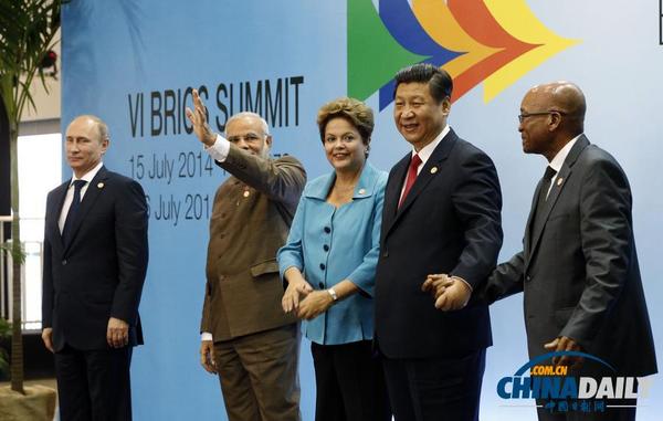 當(dāng)?shù)貢r(shí)間7月15日,金磚國(guó)家領(lǐng)導(dǎo)人在巴西福塔萊薩舉行第六次會(huì)晤。圖為金磚國(guó)家領(lǐng)導(dǎo)人合影前。