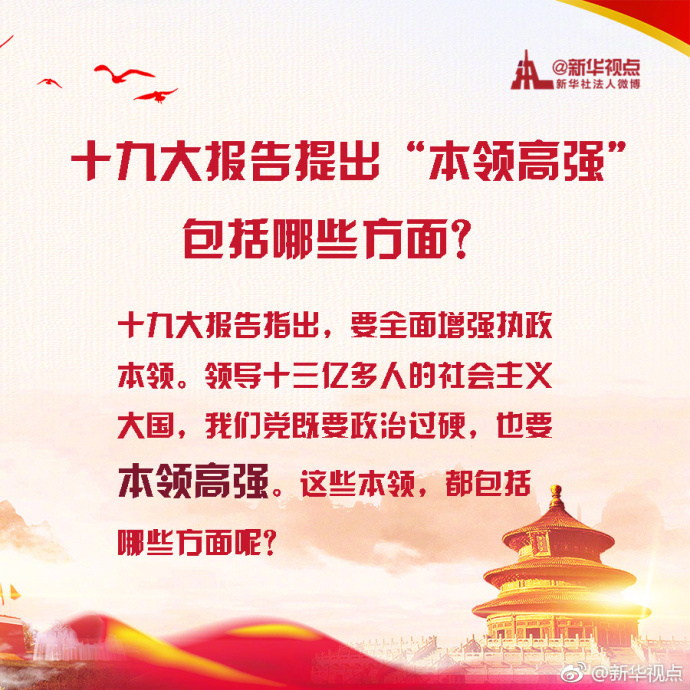 新華網北京10月19日電 十九大報告提出,領導十三億多人的社會主義大國,既要政治過硬,也要本領高強。全面增強執政本領,方法都在這里!(據新華社“新華視點”微博)