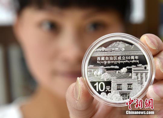 近日,中國人民銀行發行的西藏自治區成立50周年紀念幣在拉薩發售。據了解,該套紀念幣共有2枚,其中金質紀念幣1枚,銀質紀念幣1枚,均為中華人民共和國法定貨幣。