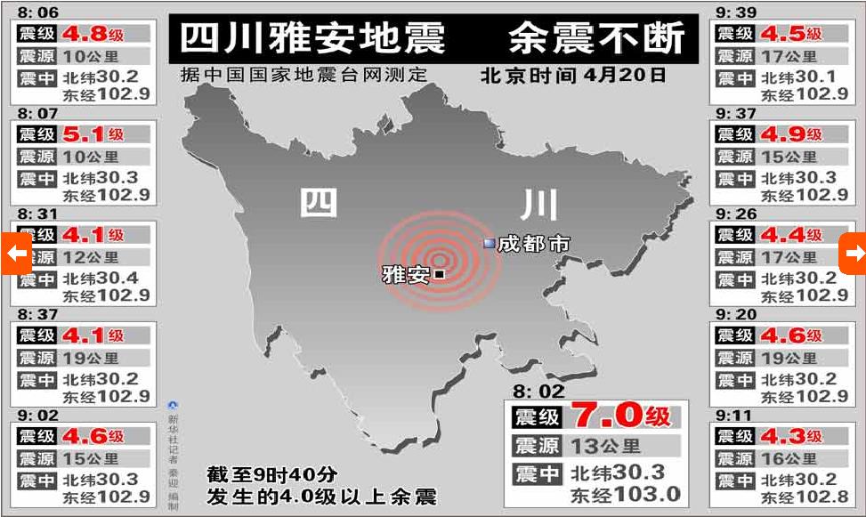 中國臺灣網4月20日消息 四川雅安蘆山縣4月20日8:02發生7.0級地震,震源深度13公里。截止上午9:40,發生多起4.0級以上余震。(據中國國家地震臺網)