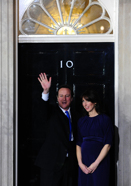5月11日,在英國倫敦,保守黨領袖卡梅倫(左)與夫人莎曼莎抵達唐寧街10號首相官邸。卡梅倫當晚接任首相職務,他應女王伊麗莎白二世的要求著手組建新一屆政府。新華社記者曾毅攝