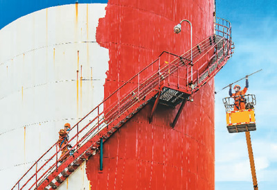 4月22日,中國石化安慶分公司工人為生產設備刷新漆。