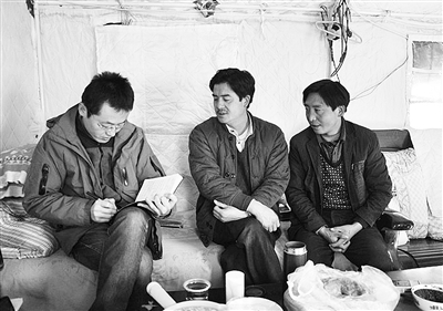 1月20日,本報記者陳發明(左一)在甘肅岷縣地震災區帳篷里采訪。