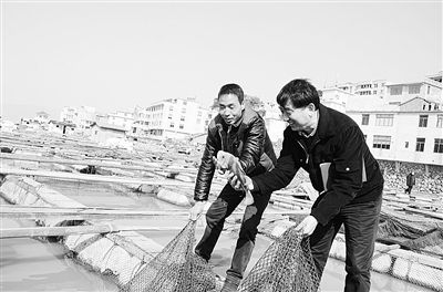 1月21日,本報記者石偉(右)來到福建福鼎市沙埕鎮采訪,與漁排養殖戶黃衛國一起查看養殖情況。