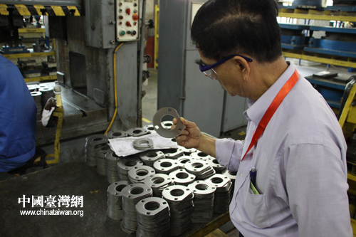 海外中國統促會會長在佳木斯市約翰·迪爾佳聯收獲機械公司仔細查看機械零部件。(中國臺灣網 徐維彬 攝)