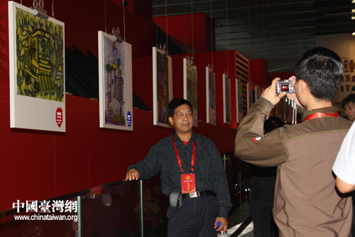 近150位海外統促會會長今日在滬參觀了上海世博會,圖為海外統促會會長在中國館內拍照留念。(中國臺灣網 楊麗 攝)