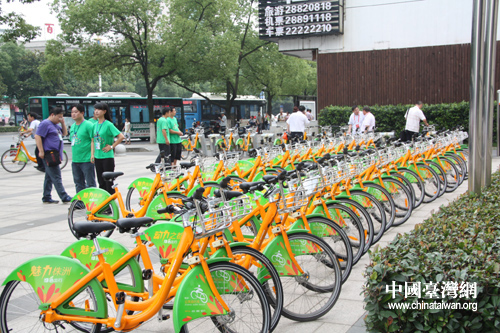 一排排的綠色自行車成為了株洲市區(qū)的一道亮麗風(fēng)景。(中國(guó)臺(tái)灣網(wǎng) 王君飛 攝)
