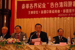 2009年1月16日,泰國中華總商會、潮州會館、和平統(tǒng)一促進(jìn)會聯(lián)合舉辦紀(jì)念中國全國人大常委會《告臺灣同胞書》發(fā)表30周年座談會,回顧兩岸關(guān)系30年發(fā)展歷程,深入學(xué)習(xí)討論胡錦濤主席的重要講話及其深遠(yuǎn)意義,共同展望兩岸關(guān)系未來。泰華各界人士共500余人與會,張九桓大使出席并發(fā)言。座談會氣氛熱烈、隆重。