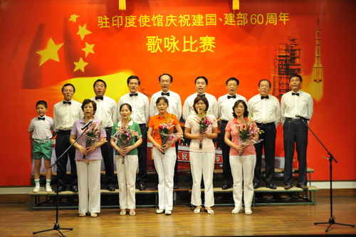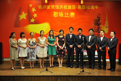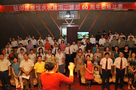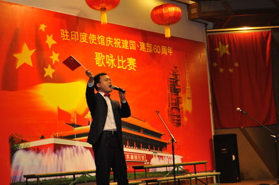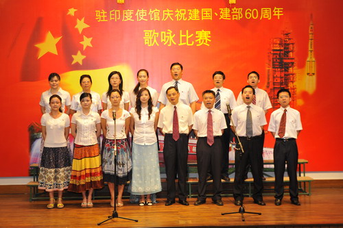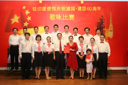 2009年9月11日,駐印度使館在館內舉辦“慶祝建國、建部60周年歌詠比賽”,張炎大使夫婦和全體館員一起參加了比賽。