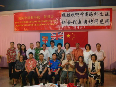 2009年6月16日,斐濟(jì)華僑華人社團(tuán)在首都蘇瓦的首都大酒樓舉行晚會(huì),熱烈歡迎由中國(guó)海外交流協(xié)會(huì)王杰副會(huì)長(zhǎng)率領(lǐng)的中國(guó)僑務(wù)代表團(tuán)一行。斐濟(jì)中國(guó)和平統(tǒng)一促進(jìn)會(huì)會(huì)長(zhǎng)袁炳棠等僑團(tuán)負(fù)責(zé)人和華僑華人100多人參加。中國(guó)駐斐濟(jì)大使韓志強(qiáng)應(yīng)邀出席。