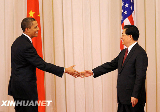 11月17日,中國(guó)國(guó)家主席胡錦濤和美國(guó)總統(tǒng)奧巴馬在北京人民大會(huì)堂共同會(huì)見中外記者。這是中美兩國(guó)元首在共同會(huì)見記者結(jié)束后握手。新華社記者李學(xué)仁攝