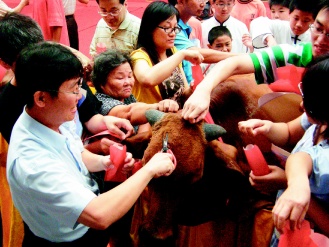 臺(tái)南縣祭孔最后拔智慧毛時(shí),民眾一擁而上,有名30多歲男子竟掏出小剪刀在牛頭上連剪3、4次,將一撮撮牛毛放入口袋。有家長(zhǎng)看見(jiàn)急著說(shuō):“智慧毛是要用拔的,孔夫子也不會(huì)認(rèn)同用剪的。”另名家長(zhǎng)說(shuō),如果不制止這種行為,以后他要將整條牛扛回家,也有人說(shuō)明年帶電動(dòng)刮胡刀來(lái)。(高大林) |