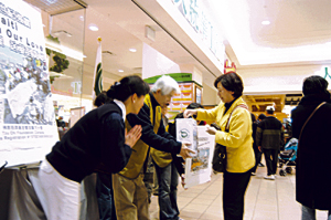 慈濟義工向捐款的善長彎腰行禮,感謝民眾救人的善心。加拿大《星島日報》