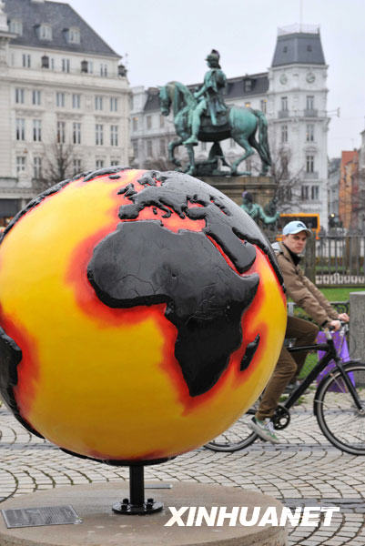 12月7日,哥本哈根市中心一個反映全球氣候變化的模型吸引了騎車人的注意。新華社記者徐速繪攝