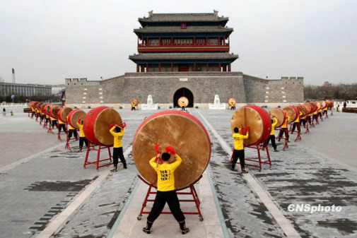12月12日是氣候變化全球行動日(Global Day of Action),國際環保組織綠色和平聯同北京20名鼓手,在北京古老的永定門城樓前擂響巨鼓,用震耳欲聾的鏗鏘鼓聲助威正在哥本哈根召開的全球氣候大會。鼓手們以中國傳統的擂鼓助威方式,通過凝重急促的鼓聲向全世界發出警告:“拯救氣候,刻不容緩”。