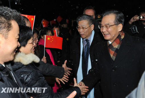 12月16日,中國國務(wù)院總理溫家寶抵達(dá)丹麥?zhǔn)锥几绫竟鱿绫竟鶜夂蜃兓瘯?huì)議。這是溫家寶受到當(dāng)?shù)厝A僑華人和留學(xué)生代表的熱烈歡迎。新華社記者武巍攝