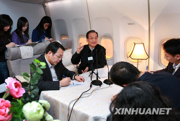 12月16日,中國國務(wù)院總理溫家寶抵達(dá)丹麥?zhǔn)锥几绫竟鱿绫竟鶜夂蜃兓瘯h。這是溫家寶在專機(jī)上接受隨行記者采訪。新華社記者龐興雷攝