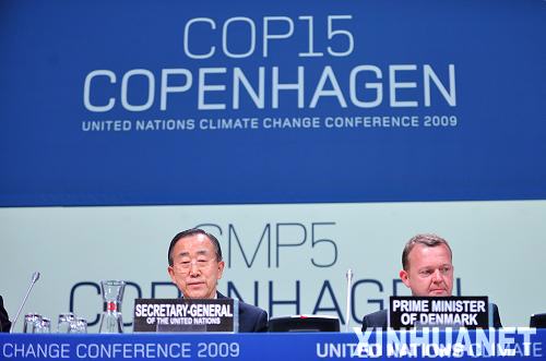 12月15日,在丹麥首都哥本哈根,聯合國秘書長潘基文(左)與丹麥首相拉斯穆森出席聯合國氣候變化大會高層會議開幕式。新華社記者武巍攝