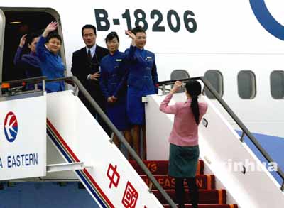 執行臺商春節包機首航任務的臺灣“中華航空公司”班機機組人員在上海浦東機場載運200多名臺商和眷屬后告別上海。新華社記者張明攝