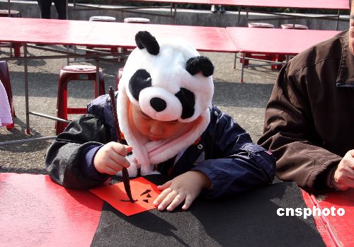 1月18日,臺灣2009己丑年全民迎新春聯揮毫在臺北“國父紀念館”舉行。圖為一名戴熊貓頭套的學童正在認真寫聯。中新社發 陳立宇 攝