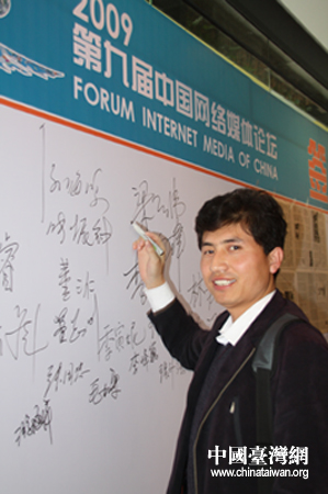 第九屆中國(guó)網(wǎng)絡(luò)媒體論壇將于明天開(kāi)幕,圖為參會(huì)嘉賓在簽名版前簽名留念。(中國(guó)臺(tái)灣網(wǎng) 陳寧 攝)