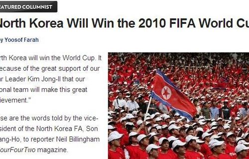 在接受442雜志的采訪時,孫光浩雄心勃勃的喊出了朝鮮隊本屆世界杯的終極目標:“朝鮮隊將會奪得世界杯冠軍!”到目前為止,這恐怕是本屆世界杯上最讓人驚嘆的爭冠宣言。在談起球隊能夠奪冠的理由時,孫光浩的態度更是十分堅定:“本屆世界杯朝鮮將會奪冠,因為我們有親愛的領袖金正日的巨大支持,這將會帶領我們達到最后的偉大目標!”