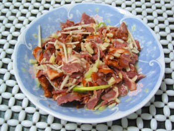 宜蘭鴨賞是一道爽口的小菜,由鴨皮、鴨胗和蔥、姜、蒜經過短暫的大火爆炒,達到氣味濃郁,鴨胗吃到嘴里脆而不膩的效果。