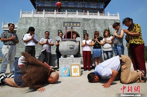 27日,來(lái)自臺(tái)灣桃園縣的“臺(tái)灣阿成”來(lái)到河北省唐山境內(nèi)的世界文化遺產(chǎn)清東陵,伏身在孝陵隆恩殿前,深情親吻“風(fēng)水寶地”17秒,并取到了他到大陸的第10罐泥土。