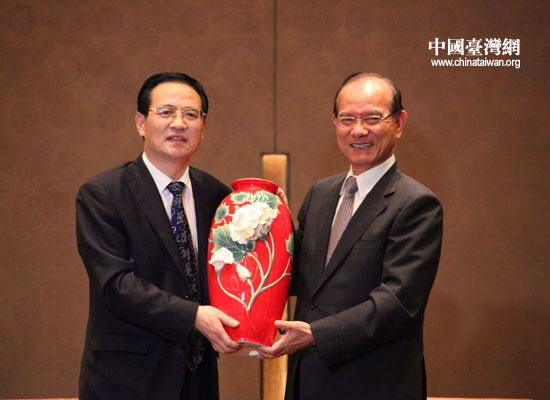 中共河北省委副書記付志方與中國國民黨榮副主席林豐正互贈禮品(攝影 中國臺灣網 陳寧)