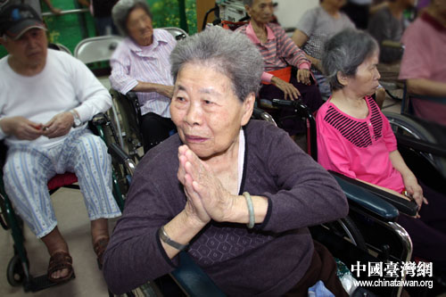 “高山青、澗水藍……”在“超女”李娜悠揚及極富帶動性的歌聲中,嘉義利河伯療養院的70余位老人一起唱起了這首傳唱度極高的報道歌曲。“哈利路亞,”生活在這里的張林滿老人在歌聲中淚流滿面,“這是我很熟悉的旋律,她長的很清秀,看到她活潑的樣子就像看到了自己的孩子一樣,很溫暖”。雖然老人夾雜著閩南語的普通話記者并不能完全聽懂,但她眼中的淚水卻代表了千言萬語。