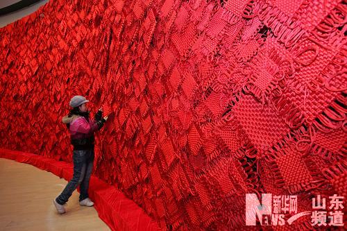 1月9日,參觀者在欣賞由中國結組成的紅墻。當日,《手藝農村——山東農村文化產業調研成果展》在中國美術館開幕。展覽通過文獻資料、實物展示、藝人演示等形式,展示了山東濰坊風箏、臨沂柳編、紅花鄉中國結、曹縣桐楊木藝、鄄城土布、巨野農民工筆繪畫等豐富的民間手藝。新華社發(趙冰 攝)