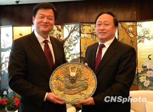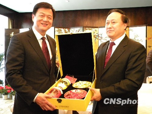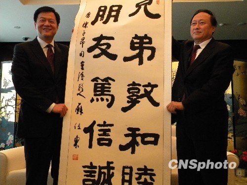 十二月二十六日,中共南京市委書記朱善璐在南京紫金山莊會見臺北縣縣長周錫瑋所率的臺北縣參訪團一行。會間,朱善璐向臺北縣訪問團贈送題有“兄弟敦和睦,朋友篤信誠”的墨寶和高淳陶瓷,而周錫瑋回贈了臺灣著名的瓷器精品。中新社發 朱曉穎 攝
