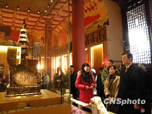 十二月二十七日下午,前來南京參加“雙城論壇”臺北縣長周錫瑋一行前往南京朝天宮參觀七寶阿育王塔。周錫瑋所率的臺北縣參訪團于當日上午抵達南京、開始訪問行程,為期三天。中新社發 朱曉穎 攝
