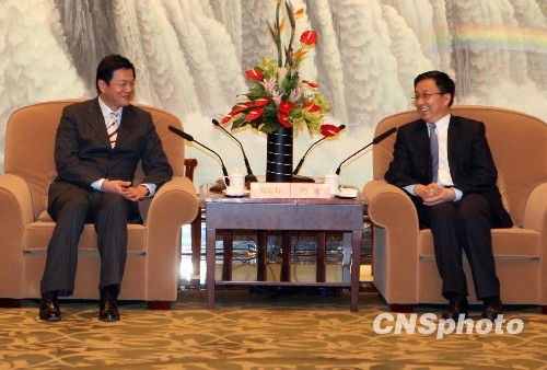 12月28日晚,上海市市長韓正(右)在上海興國賓館會見到訪的臺北縣縣長周錫瑋(左)一行。中新社發 湯彥俊 攝