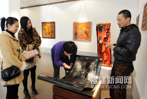 1月4日,近百件樸實典雅、深沉蘊蓄,文人韻味濃郁且出自閩臺藝術家之手的漆藝、壽山石雕精品,亮相在福州舉行的《中國漆與壽山石》主題藝術展 ,吸引不少年輕觀眾的目光。列入第一批國家級非物質文化遺產名錄的漆藝和壽山石雕,是福州非物質文化遺產的代表性門類。(記者 劉可耕 攝)