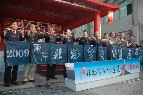 文化部非物質(zhì)文化遺產(chǎn)司副司長(zhǎng)屈盛瑞和臺(tái)灣當(dāng)局文化主管部門負(fù)責(zé)人盛治仁、臺(tái)中市市長(zhǎng)胡志強(qiáng)等以創(chuàng)意藍(lán)染的方式,現(xiàn)場(chǎng)染出“2009兩岸非物質(zhì)文化遺產(chǎn)特展”的字樣,揭開這一兩岸非遺交流盛事的序幕。盛治仁說,這是兩岸首度精心籌劃共同推出非遺特展,展現(xiàn)兩岸文化資產(chǎn)交流層面的深度與廣度,有利于增進(jìn)雙方的了解。胡志強(qiáng)表示,兩岸首度攜手在臺(tái)中合辦非遺大型展覽,對(duì)于增進(jìn)雙方感情甚有助益。
