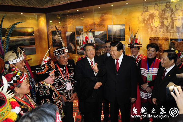來自寶島臺灣少數(shù)民族民意代表,各族群頭目、長老50余人陪同賈慶林主席觀看了展覽,并向賈慶林主席介紹了臺灣少數(shù)民族歷史、文化和生活方面的情況。